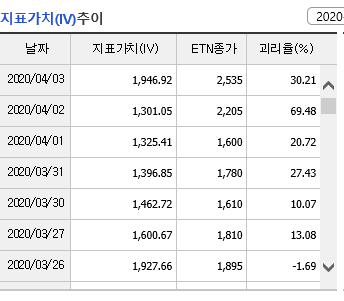 한마디로 4월2일 15:30분의 WTI유가 시세보다 ETN종가가 69.48% 비싸다 라는 표시 입니다.