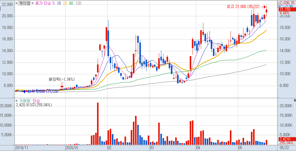 현재로서는 가장 매매하기 괜찮은 마스크 관련주는 '케이엠' 입니다.