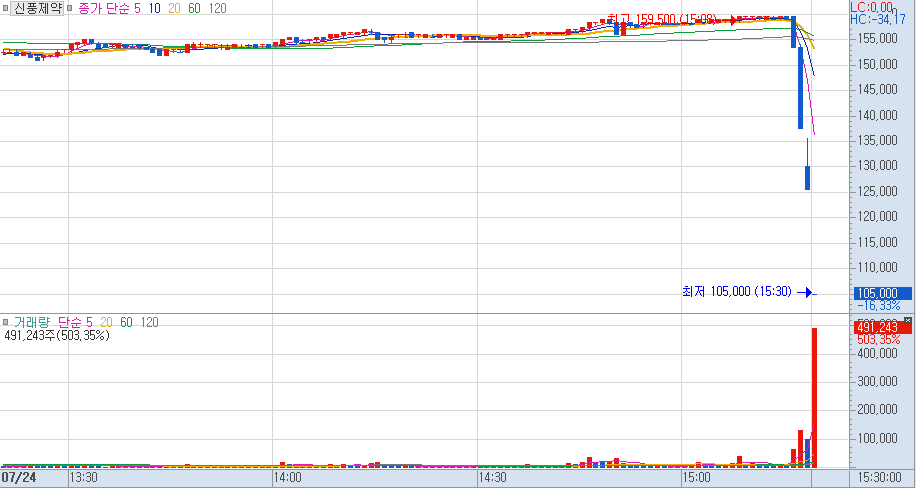 2020년 7월 24일 금요일 신풍제약이 상한가 근처가격(29.67%) 159,500원을 유지하다가 장막판 5분은 남겨두고 급락하여 -14.63%으로 마감하였습니다.