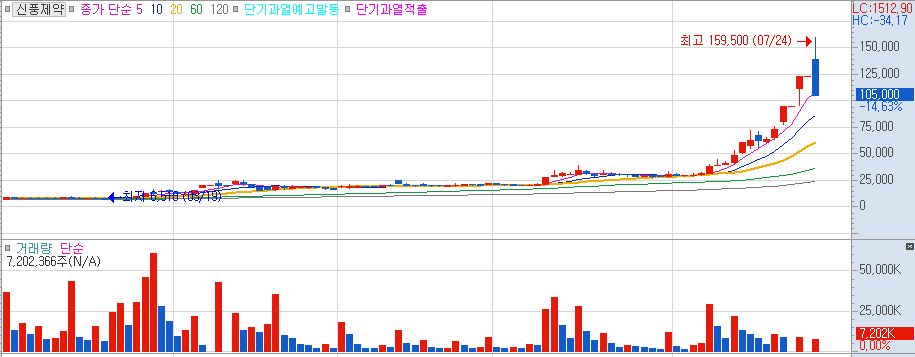 신풍제약은 코로나사태 이전의 가격은 6000원 ~ 8000원 정도의 가격이였으나 3월말 코로나관련주로 부각받으면서 급등을 시작하여 2만원을 유지하더니 6월 중순부터 다시 한차례 급등을 하여 3만원이 되었고 7월부터 연속된 급등으로 7월 24일 최고점이 159,500원을 찍었습니다.