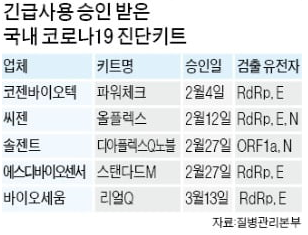 우리나라에서 승인받은 진단키트는 코젠바이오텍, 씨젠, 솔젠트, 에스디바이오센서, 바이오세움 이 있습니다.