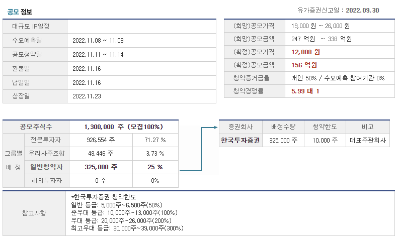 확정 공모가액은 12,000원으로 공모금액은 156억원 입니다.
