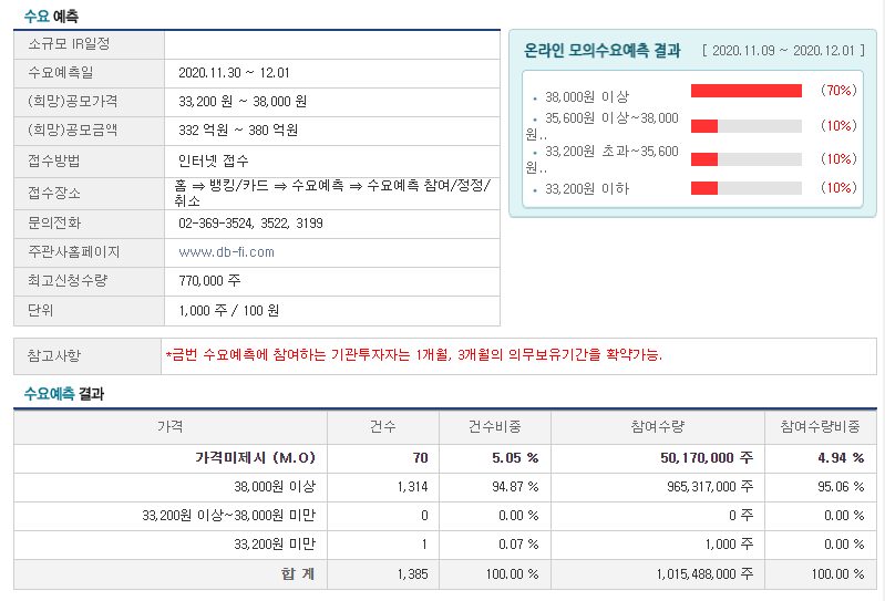 수요예측결과에서는 38,000원 이상이 무려 70%가 나와서