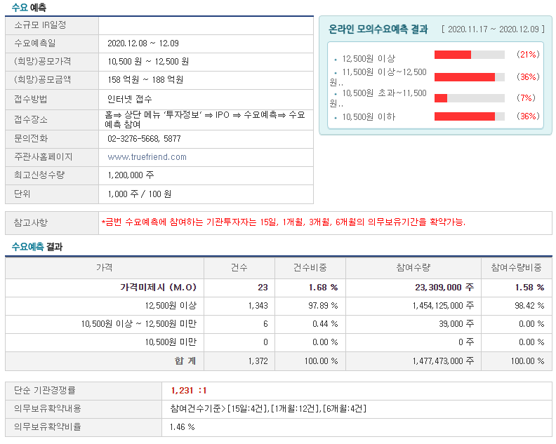 수요예측결과에서는 최상단 12,500원 이상이 무려 98.42%가 나왔습니다.