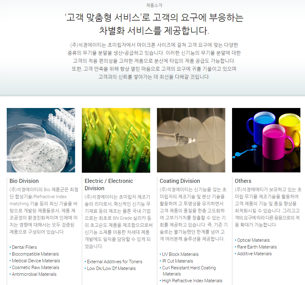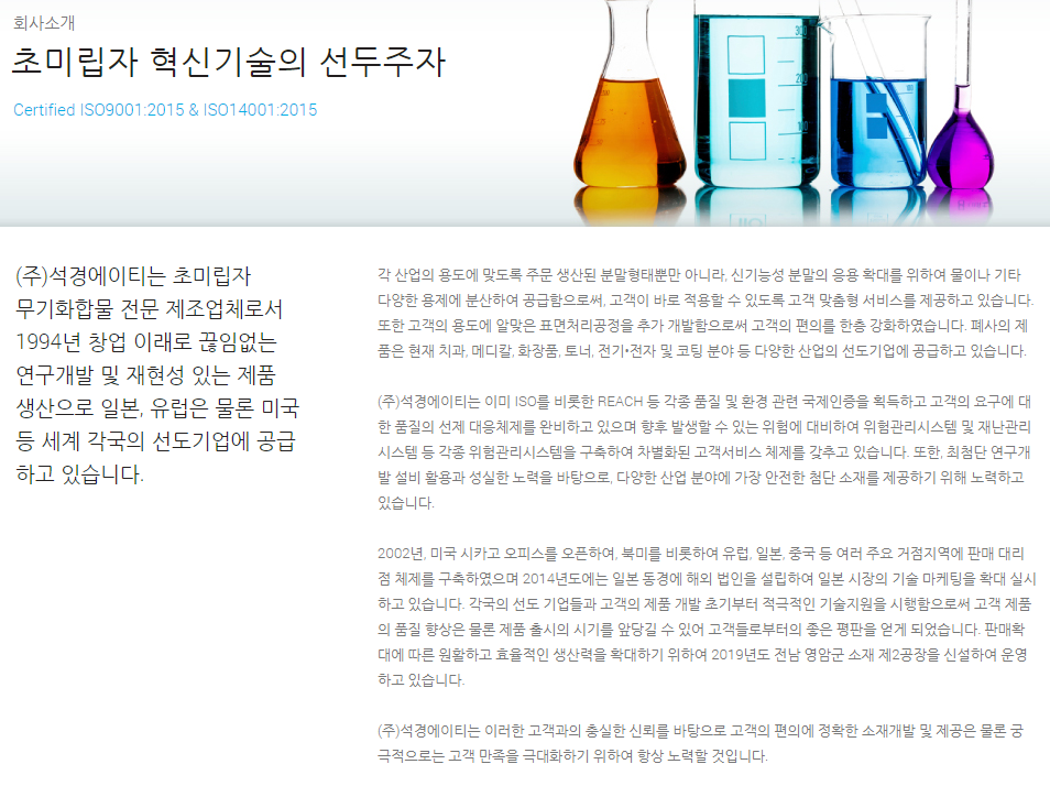 실제로 홈페이지를 방문하면 표면처리에 필요한 초미립자를 제조하여 화학업쪽으로 파악됩니다.