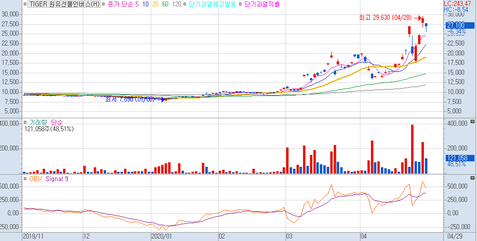 원유가격이 $20대로 떨어져 수익률이 높아진 원유 인버스 ETF 입니다.