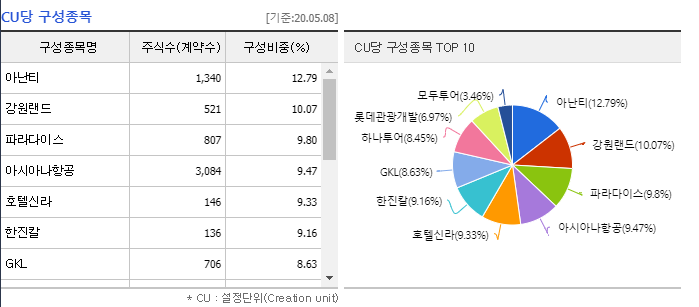 하지만 구성종목을 보니 대북주 아난티와 경영권분쟁을 겪고 있는 한진칼이 포함이 되어있어서